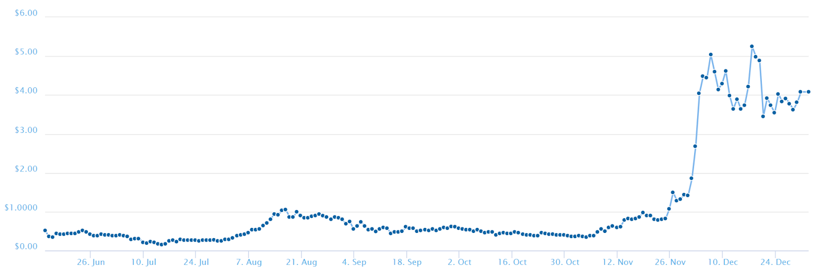 Price IOTA over time found on Coin Gecko: https://www.coingecko.com/en/price_charts/iota/usd