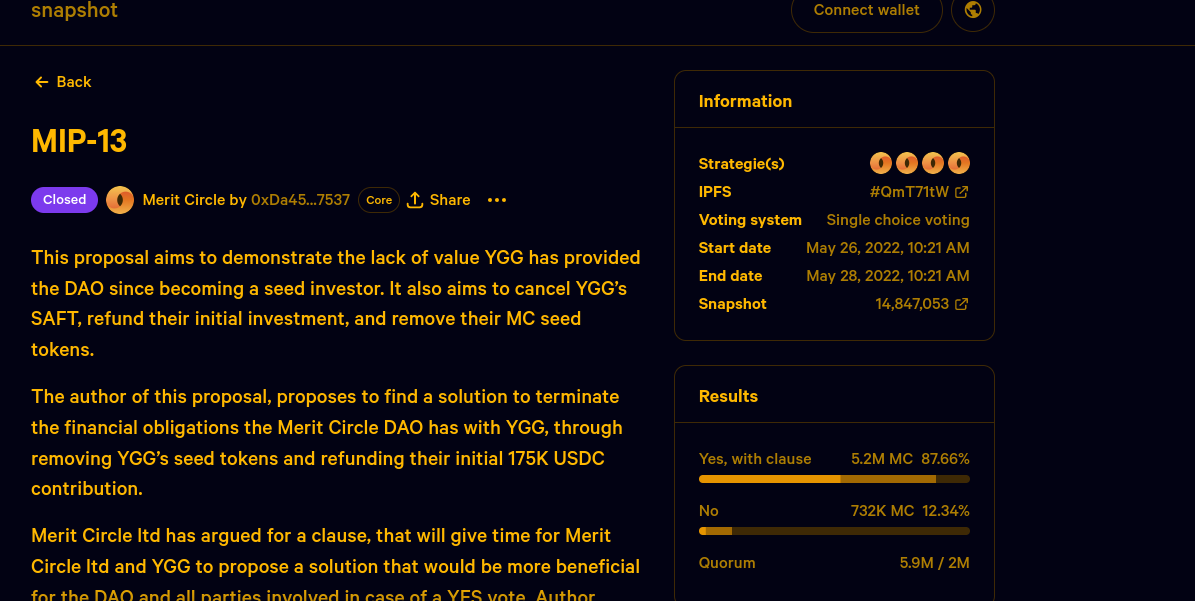 Although this proposal was contrary to the agreement between Merit Circle and YGG, had no legal backing, and would have led to a long protracted legal battle should YGG choose to pursue it, the proposal was overwhelmingly voted in.