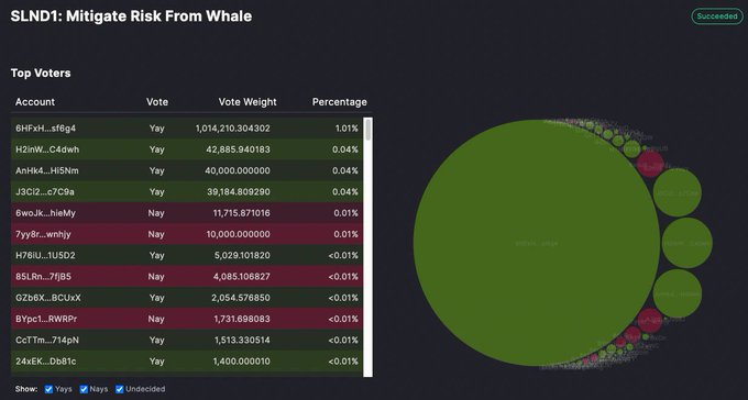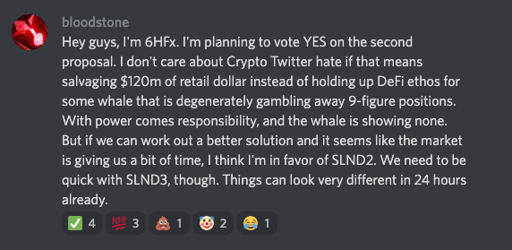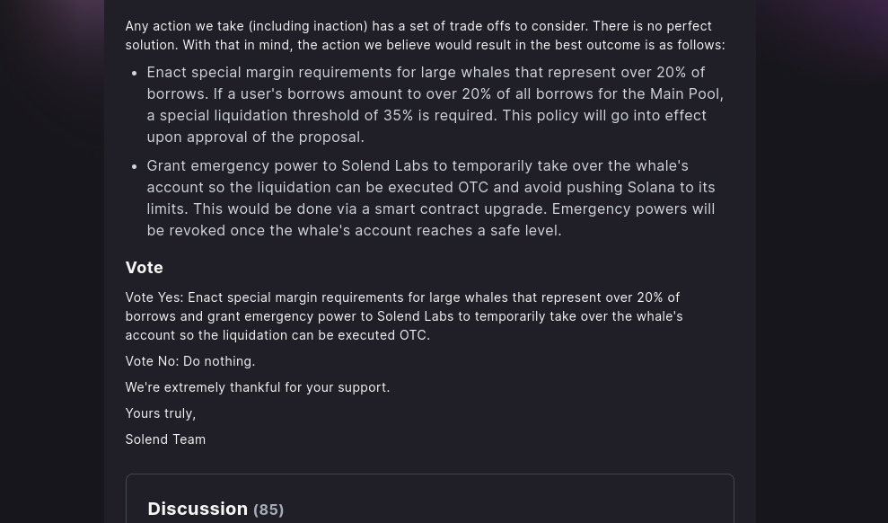 To counter this, the protocol set up a DAO and drafted a proposal that, if passed, grants the protocol "emergency power" to temporarily take over the whale's account and liquidate it OTC so as to avoid "pushing Solana to its limits."