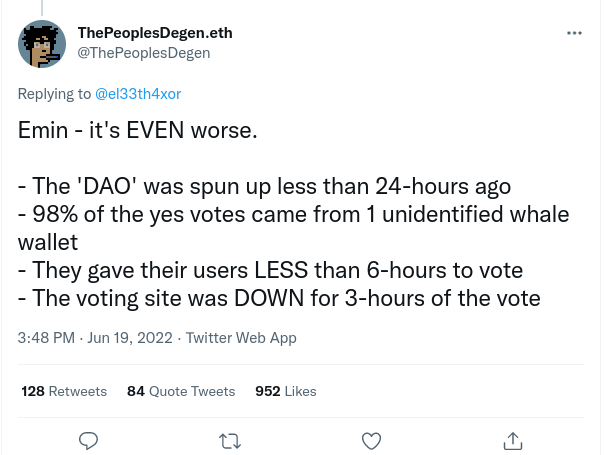 Whether these idealistic concepts match up with DAO governance in real life is another matter. For example, after the famous LUNA death spiral debacle, some online investigators have claimed that Do Kwon allegedly used his secret bagholder wallet to