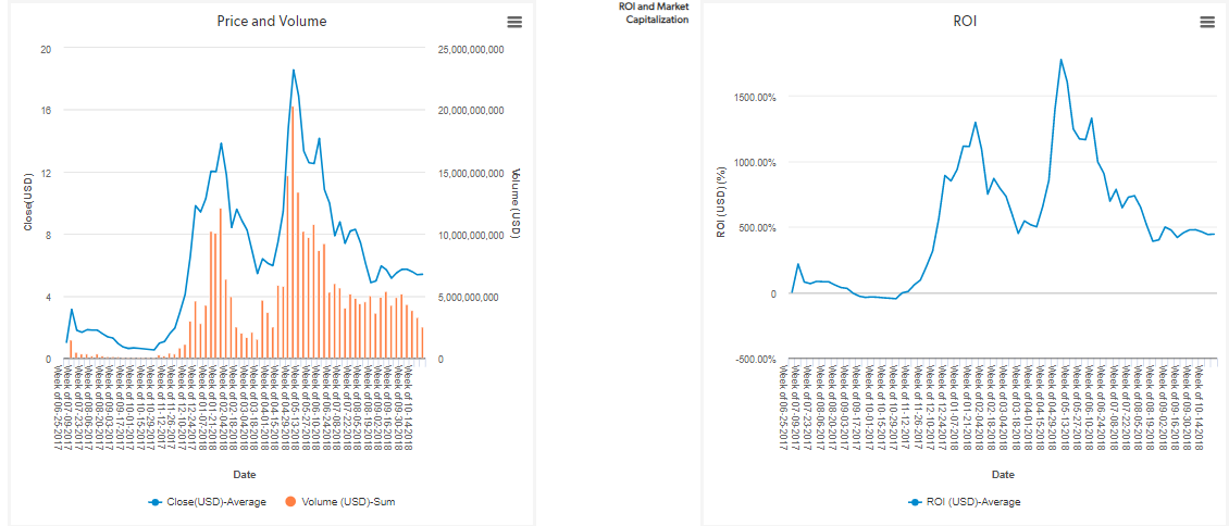 EOS saw hit its all-time in the Last week of April 2018 at 1775.90%. It also witnessed an all-time-low in its RoI at -44% during the third week of October 2017. However, since then the ROI trend has been facing bear market for the past 6 months.