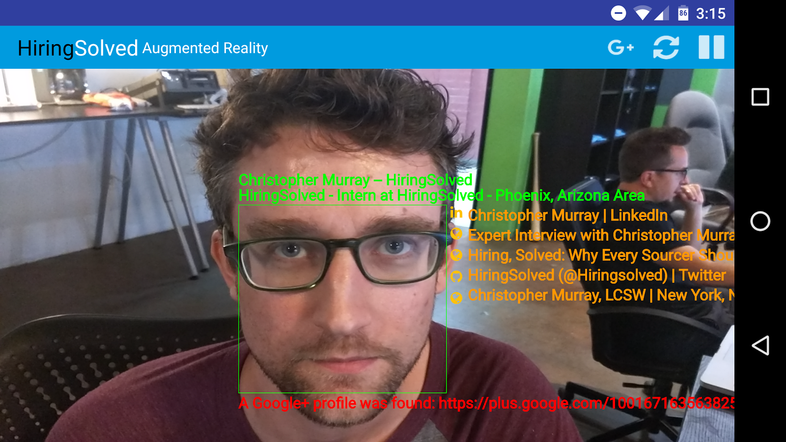 In the Alpha version of HiringSolved’s AR tech, we trained our machines to identify me, Christopher Murray, by telling it my name and subsequently capturing 50 frames of my face. These images were encoded using the HOG method and the output was passed through a neural network which captured the 128 measurements which uniquely identify me.