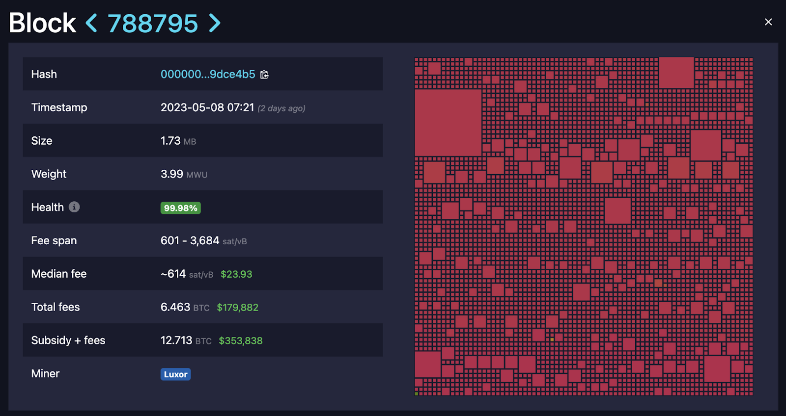 A block from a mining pool containing 6.463 BTC in fees. Source: