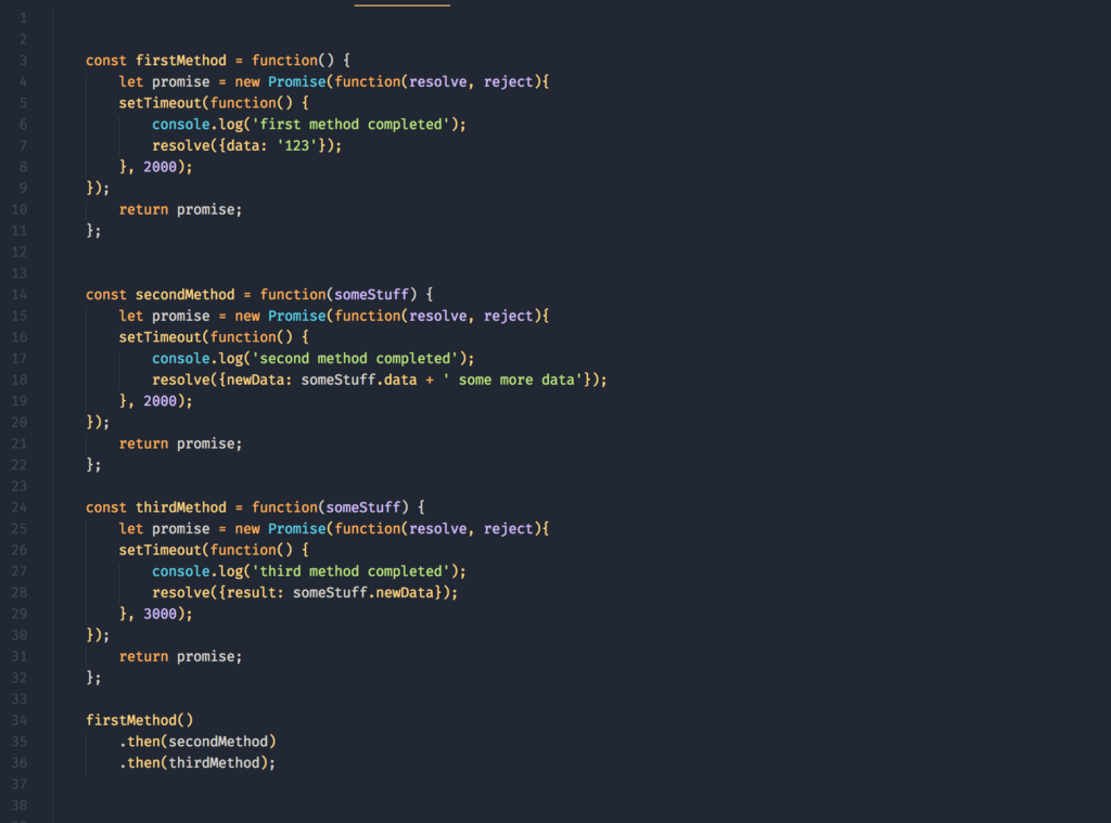 You can see how lines 34–36 are much cleaner than our callback examples.