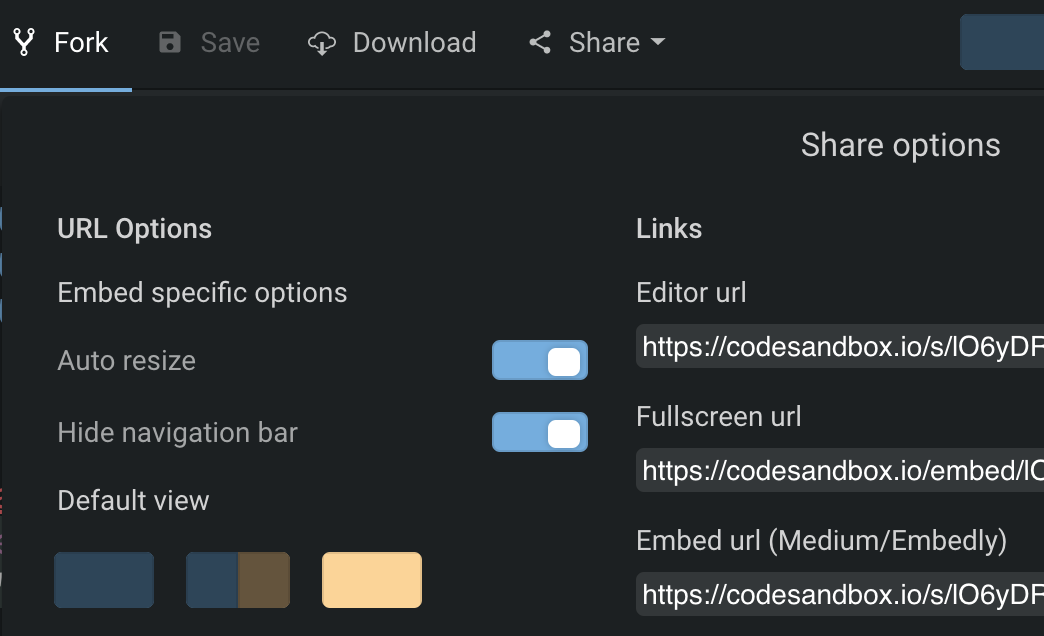 Then goto the share button and check “Hide navigation bar” and “Auto resize” now copy and paste the Medium URL into an article and press enter. In the future CodeSandbox plans to allow you to publish each sandbox on its own subdomain. This will mean each sandbox can have its own private localstorage and IndexDB. It will allow users to sign up to API providers that require a domain. Having your own subdomain may even enable sandboxes to be monetized with attention tokens in the future. Brave payments for content providers are currently only at the domain level.