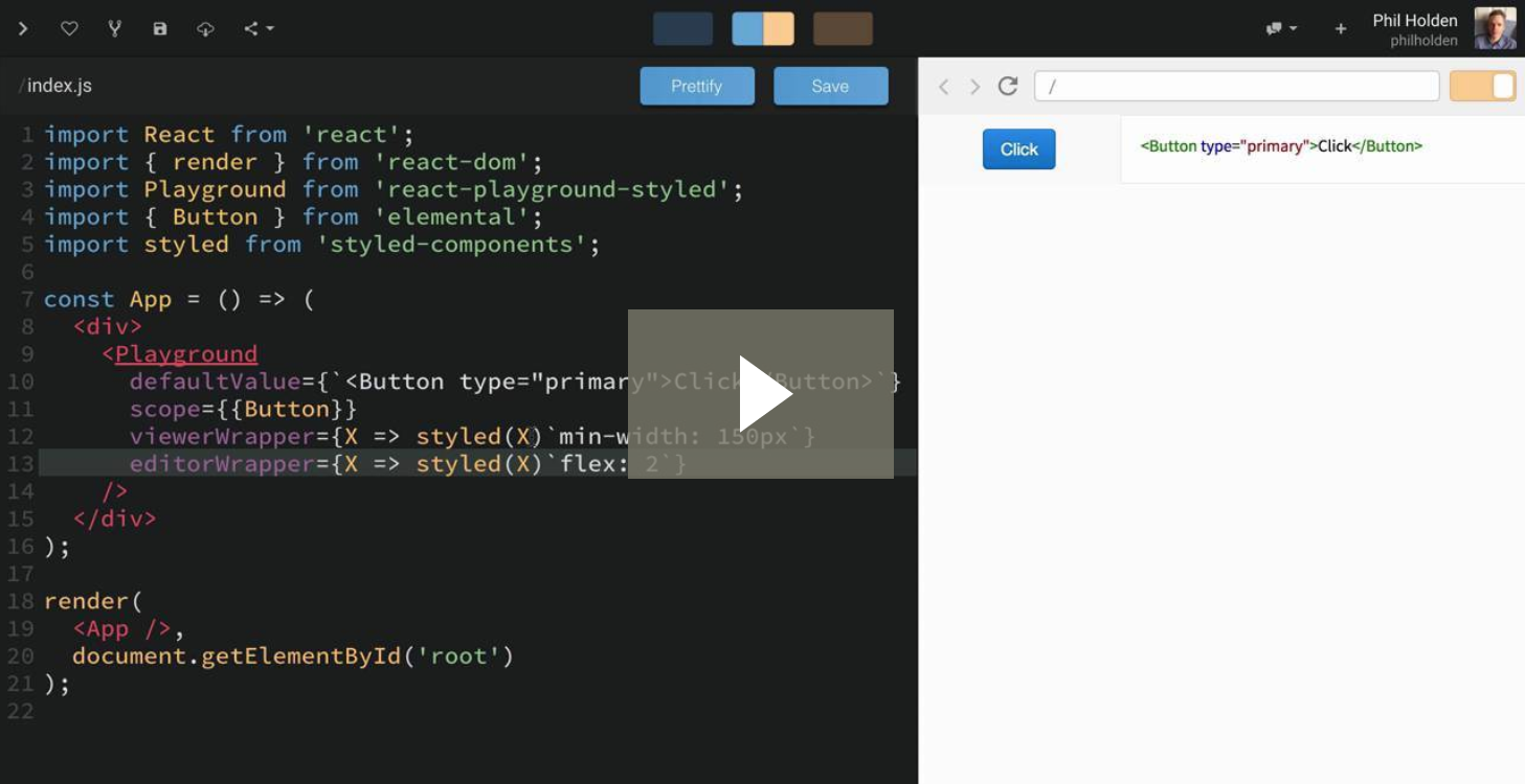 In my work for my previous employer NCR Edinburgh I have been creating living documentation for a component library (NCR has been a great employer for me, they invested a lot in me and gave me so many opportunities to learn … thanks!). The docs enable developers to play with components live and edit their props. It is inspired by Formidable Labs documentation for Victory charts. To help with this task I created react-playground-styled (Egghead video below).