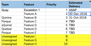 The initial backlog in Figure 1 was updated to reflect an incoming customer escalation that was assigned to team Quay. That team had to temporarily put their work on Feature A down to deal with the escalation. Similarly, Feature I was added to the backlog at priority 8 pushing Feature F further down.