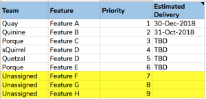 The diagram above shows the result of this bootstrapping process, which results in an ordered list of features. Features are assigned to an available product delivery team, who will usually start off by providing a delivery SWAG for their feature. Features with no team assigned to them will be worked on in priority order as soon as a product delivery team frees up.