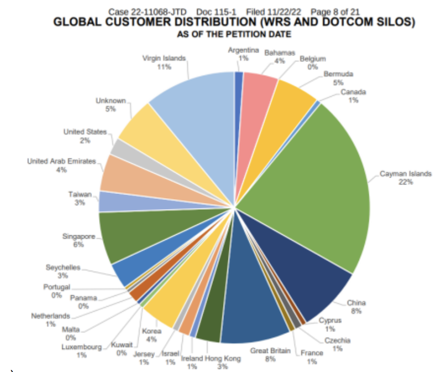 In one Chapter 11 filing, John Ray included a graph regarding FTX customers by jurisdiction, claiming that over 20% of users were from the Cayman Islands. In fact, according to data from October 20th, 2022, less than 1% of trading accounts on FTX were from the Cayman Islands.