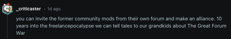 I got this very unpleasant corporate “there can be only one” vibe. I dare to say that the official sub would be very happy if the unofficial one is less active, but the hearts and minds of my fellow freelancers aren’t for grabs. What’s even more interesting and worth admiring is that the mods of the unofficial sub are super respectful and down to earth. Here’s a link to the Reddit post that helped me draw these conclusions.