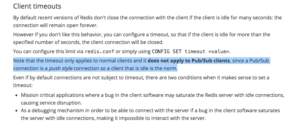 The issue has been open for years. So, naturally, this presents an opportunity to roll up my sleeves and figure out a way. Redis (v3.2+) has had “PING” on Pubsub connections for a while now. This means that connection idle time can be managed with a series of heartbeat pings.
