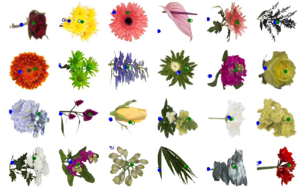 Above are a few annotated flowers from the training set. It shows the same flower at a few different angles. The stem position is in blue and the flower top position in green.
