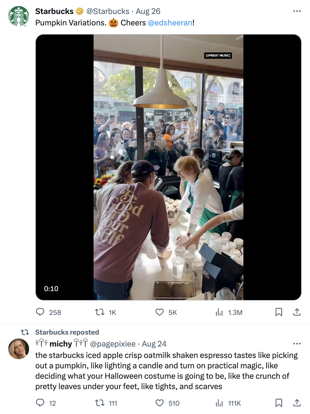 \In the above excerpt from the Starbucks X account, we can see that the brand is no stranger to utilizing social proof in the form of a positive repost or a celebrity endorsement to boost engagement.