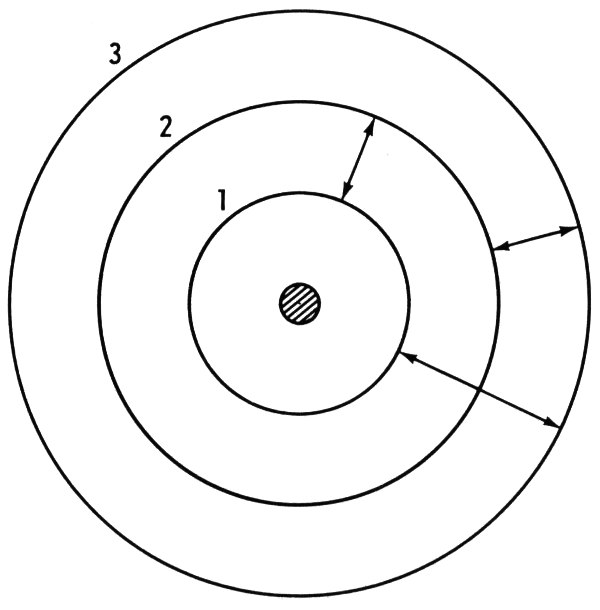 But if the right amount of energy is put into the atom, one of its electrons will merely be raised to a higher energy level. Shown in Figure 9, for instance, are the ground state (Circle No. 1) and two possible higher energy levels. As you can see there are three possible transitions.