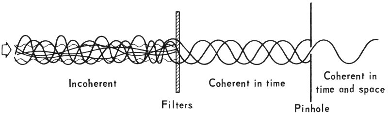 We would then have monochromatic (one color) light, which is temporally coherent radiation, but it would still be spatially incoherent. In our diagram, we show three monochromatic waves. If we then passed this light through a tiny pinhole as shown, most of these few remaining waves would be blocked; the ones that got through would be pretty much in step. (In a similar manner, a true point source of light would produce spatially coherent radiation; but, as in the process described here, there wouldn’t be very much of it.)