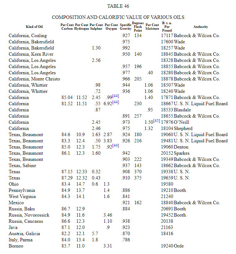 Table 46, compiled from various sources, gives the composition, calorific value and other data relative to oil from different localities.