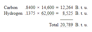 Calorific Value—A pound of petroleum usually has a calorific value of from 18,000 to 22,000 B. t. u. If an ultimate analysis of an average sample be, carbon 84 per cent, hydrogen 14 per cent, oxygen 2 per cent, and assuming that the oxygen is combined with its equivalent of hydrogen as water, the analysis would become, carbon 84 per cent, hydrogen 13.75 per cent, water 2.25 per cent, and the heat value per pound including its contained water would be,