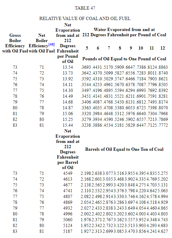 Many tables have been published with a view to comparing the two fuels. Such of these as are based solely on the relative calorific values of oil and coal are of limited value, inasmuch as the efficiencies to be obtained with oil are higher than that obtainable with coal. Table 47 takes into consideration the variation in efficiency with the two fuels, but is based on a constant calorific value for oil and coal. This table, like others of a similar nature, while useful as a rough guide, cannot be considered as an accurate basis for comparison. This is due to the fact that there are numerous factors entering into the problem which affect the saving possible to a much greater extent than do the relative calorific values of two fuels. Some of the features to be considered in arriving at the true basis for comparison are the labor saving possible, the space available for fuel storage, the facilities for conveying the oil by pipe lines, the hours during which a plant is in operation, the load factor, the quantity of coal required for banking fires, etc., etc. The only exact method of estimating the relative advantages and costs of the two fuels is by considering the operating expenses of the plant with each in turn, including the costs of every item entering into the problem.
