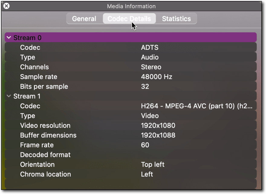 If we view the codec details in VLC (via CTRL+i or CMD+i), we'll see that the stream that we chose has a resolution of 1920x1080, so this is the 1080p stream for this channel.