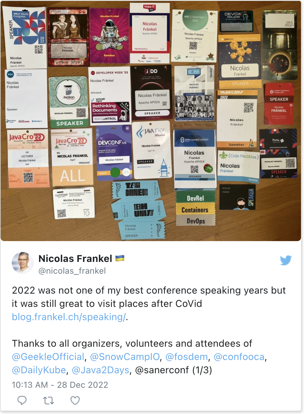 Anyway, 2022 numbers are below 2019's, the last "regular" year. Despite this, I'm ok with it: 2019 was hard on me, and conference attendance is more of a marathon than a sprint. I think I've found the sweet spot between public speaking and other activities.