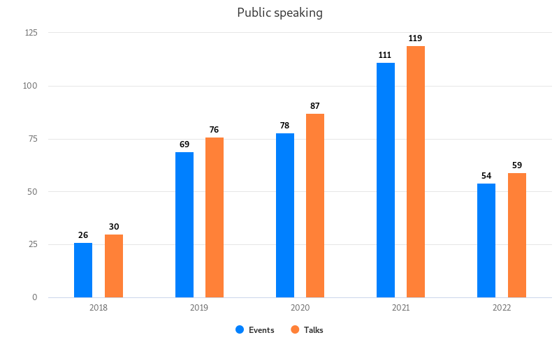 Raw numbers are a bit misleading: because of Covid, I spoke at many events online in 2020 and 2021. It's much easier to do so than traveling to another country (or continent!); on the other hand, engagement is much lower, not to mention the lack of social interactions.