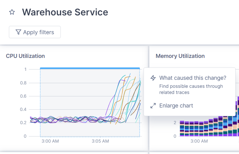 The Change Intelligence feature helps you connect a problem in the application with the specific code change that introduced it. You can review a metric and identify related traces (and even deployments) associated with that metric.