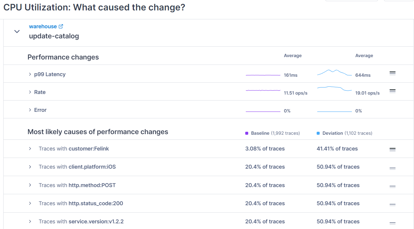 We can see on the last line that there was a change in the version of the service captured in this group of traces that coincides with the spike in CPU utilization.