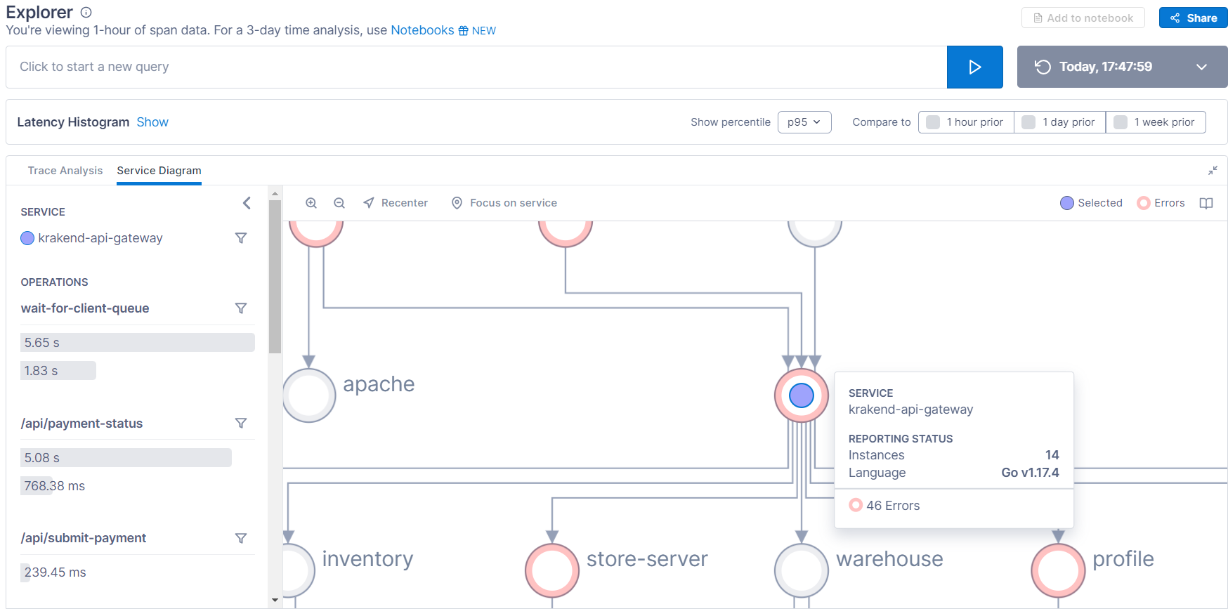 Using the dashboards makes it easier to see all of the moving parts. The Service Diagram enables a holistic view of your microservices. It shows the direction of traffic flow, whether or not errors are occurring, and general metrics of the flow between services.