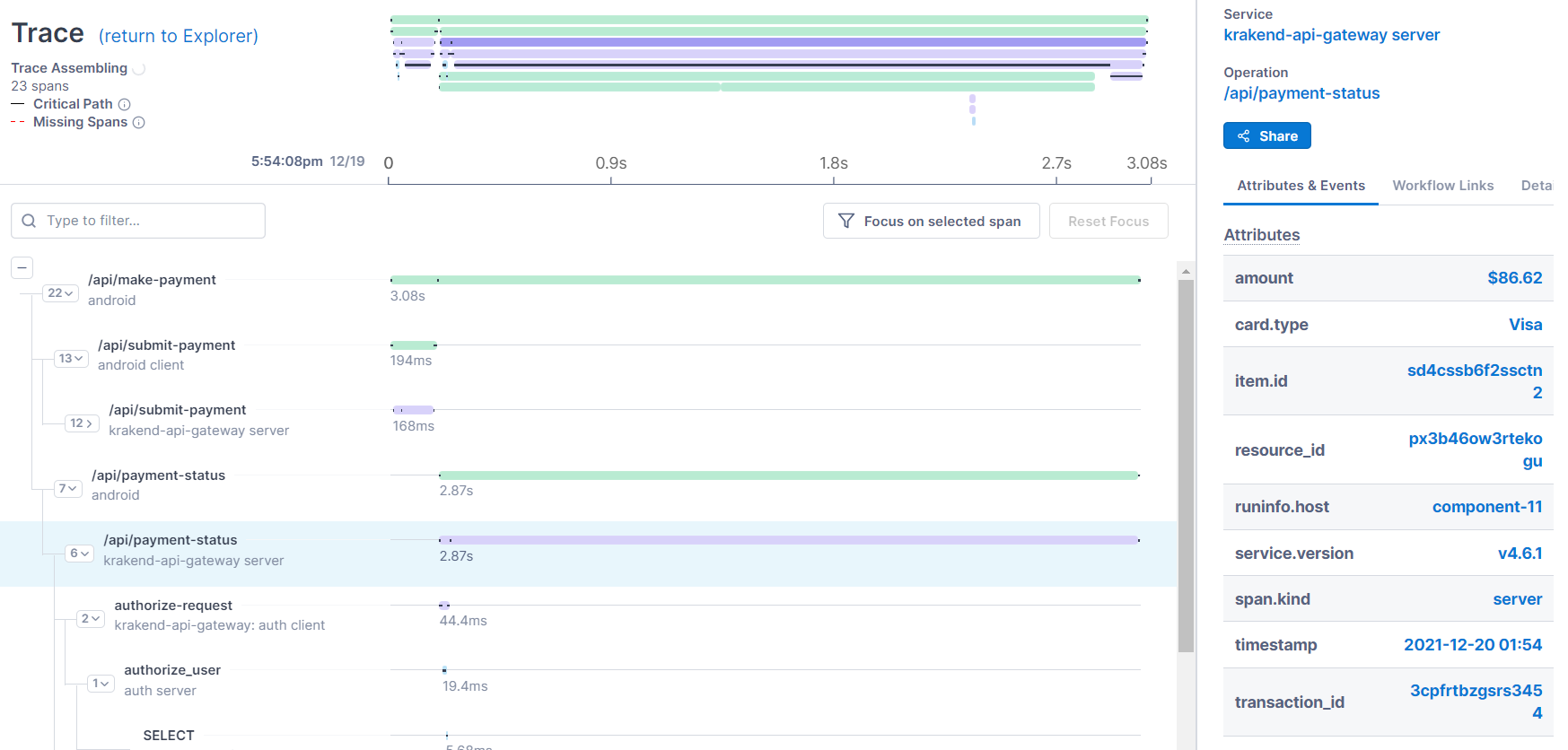 Another feature worth noting is distributed tracing, which helps you wrangle all your microservices into one view. This will show you the length of each phase, what endpoints it hit, and numerous other bits of information that will help make sense of what went wrong and how to fix it.