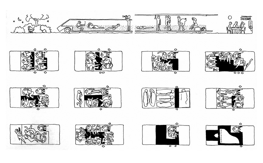 The Kar-A-Sutra was designed from the inside out, as Bellini tried to “make the car a mobile human space.” The primacy of the driver was removed in favour of an open space for gathering, eating, or sleeping or other “pleasurable” communal activities. There were no seats, but an assortment of cushions made from a first-generation memory foam. The cushions could be rearranged at will to form all manner of seating or sleeping surfaces. A continuous thin storage container ringed the passenger compartment so that items could be stored away.