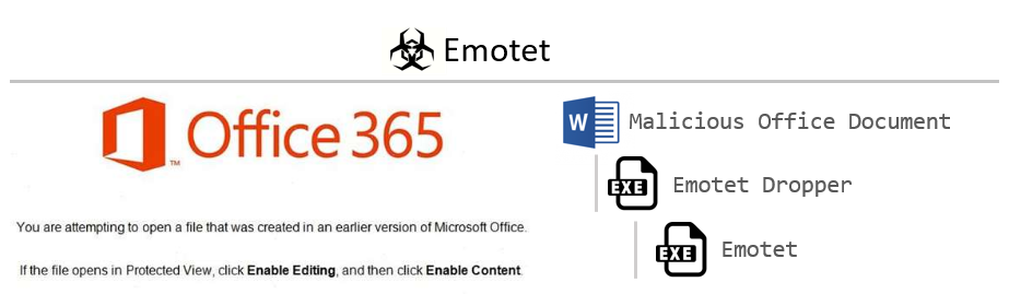 Let’s start by analyzing the famous Emotet Banking Trojan, which is a continuous threat that targets a lot of countries and company sectors (The Evolution of Emotet). The dropper spreads through email phishing and downloads the malware using a malicious Office macro.
