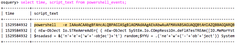 If we run the sample in our environment with Osquery installed, we can build a query to retrieve events generated by PowerShell from the powershell_events table. Osquery reads the Microsoft-Windows-PowerShell eventlog channel, so you need to enable Script block logging.
