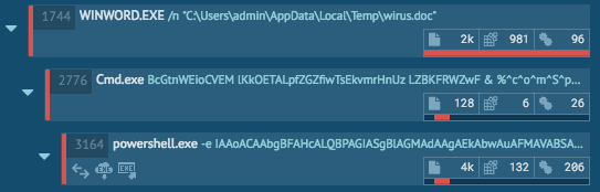 As we can see in the sandbox report, the Office macro executes PowerShell with an encoded command to download the payload.