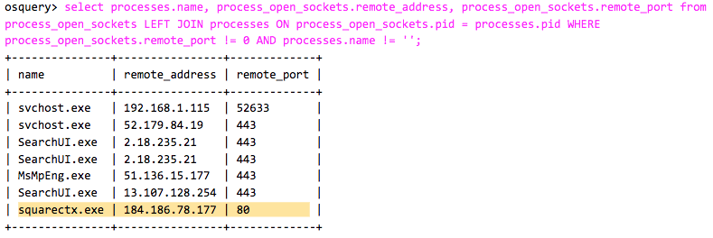 select processes.name, process_open_sockets.remote_address, process_open_sockets.remote_port from process_open_sockets LEFT JOIN processes ON process_open_sockets.pid = processes.pid WHERE process_open_sockets.remote_port != 0 AND processes.name != ‘’;