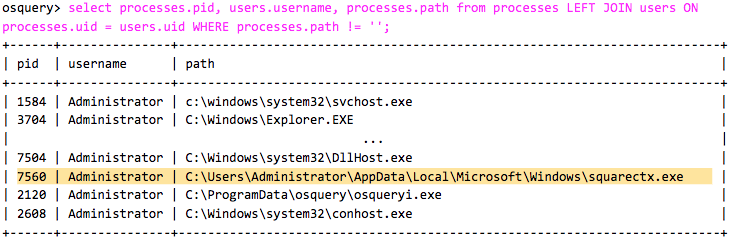 The downloaded file from PowerShell is a Emotet dropper that extracts the final payload and executes it (squarectx.exe). Now, let’s query the system running processes. Similar to above, we can do a JOIN with users table to see the username column. Some rows have been omitted for a cleaner view.