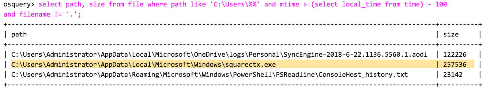 It’s interesting to see which files have been written on disk during the payload download. To do so, we can query the file table that stores some useful fields (file table schema). This table needs a WHERE condition to return results, so we can add some filters like Users directory and files created in the last 100 seconds for example.