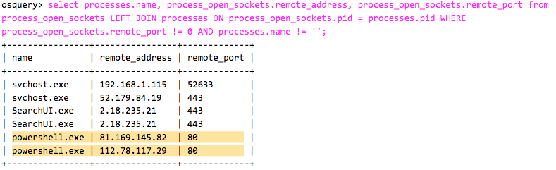 Once PowerShell is downloading the payload, Osquery can log socket connections opened by any process. We can do an easy JOIN between process_open_socket table and processes table to see which processes are making network connections.