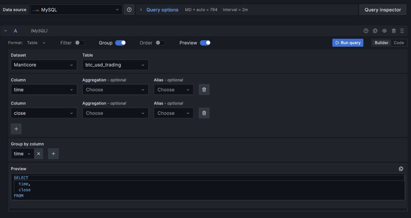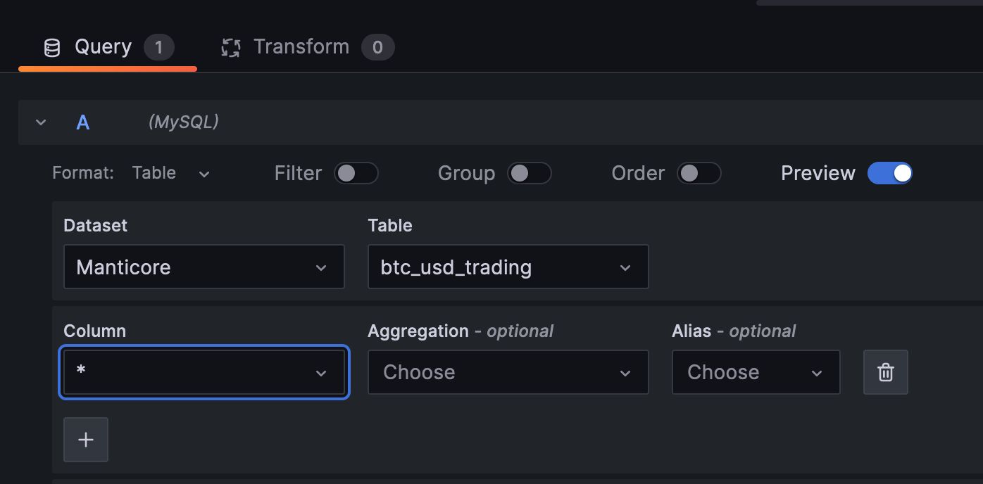 Use Grafana’s query builder or simply write an SQL query to fetch the data you want to visualize from your Manticore Search database.