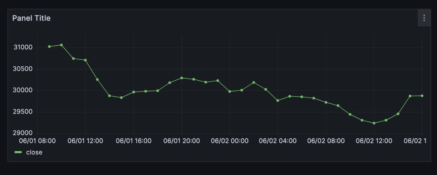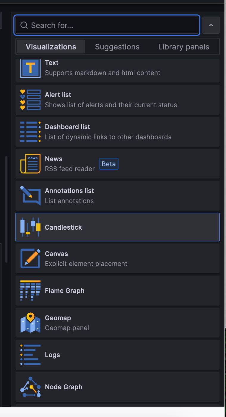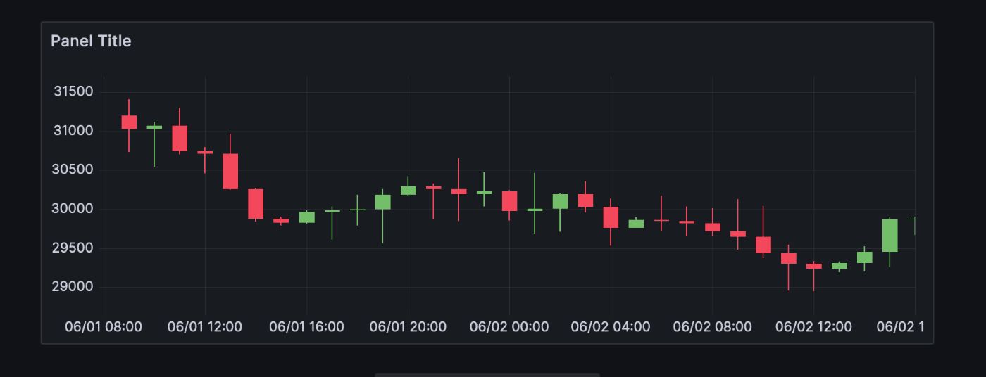 It’s easy to change the style of a chart, as in this example, we used Bitcoin prices. Simply choose Candlestick and adjust the query builder by selecting all fields. This will provide an entirely different view of your data in Grafana.