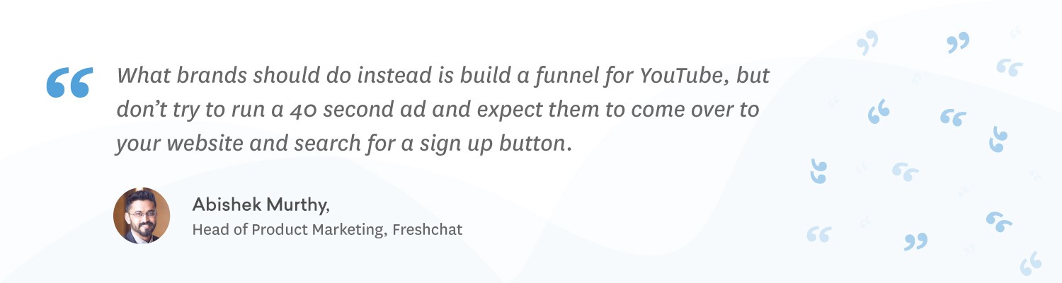 However, our early experience with YouTube ads was a little disappointing because it didn’t lead us to the goals we had set for ourselves. We spent quite some money to advertise Freshchat on YouTube. In return, we had to scrap the bottom of the YouTube barrel to get sign-ups from those ads. The returns from the YouTube ads didn’t justify our investment.