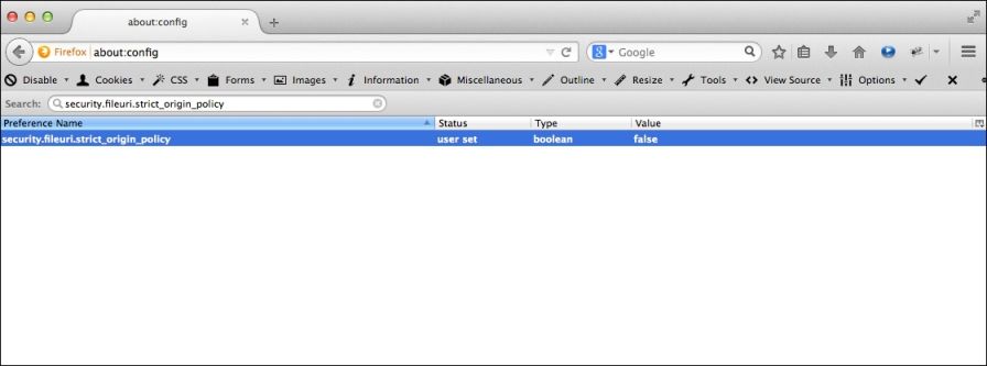 Double-click on the security.fileuri.strict_origin_policy entry to toggle its value. Set it to false to disable the strict origin policy for local files.