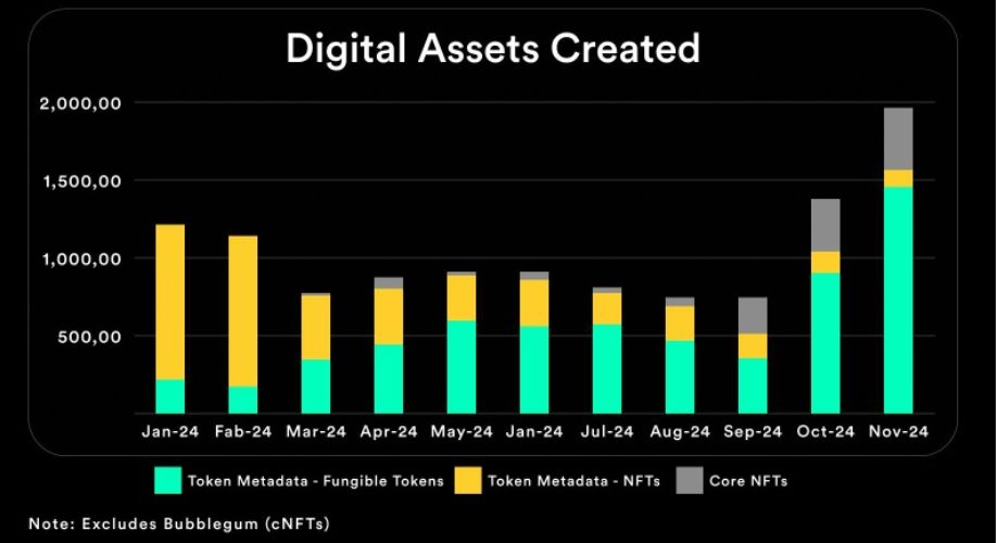- Metaplex saw extraordinary growth in fungible token creation, with 1.4M new tokens minted — marking a 56% increase month-over-month compared to the previous all-time high in October 2024 and a new monthly record. This represented 94% of all Token Metadata assets created, driven primarily by memecoin activity on platforms such as Pump.fun.