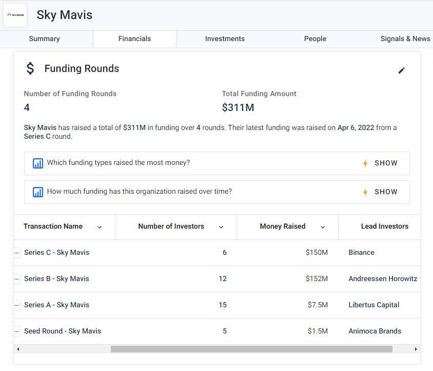 What’s the reason why Sky Mavis has raised a total funding amount of $311M from 28 investors including Animoca Brands, a16z, and Binance?