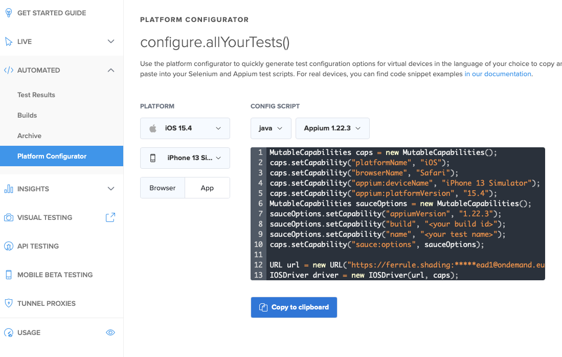 The next is capabilities configuration. Follow Automated → Platform Configurator on left sidebar and get caps for needed environment: