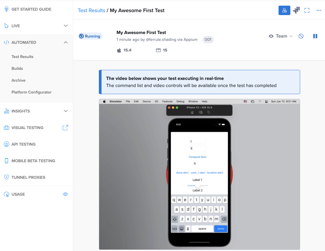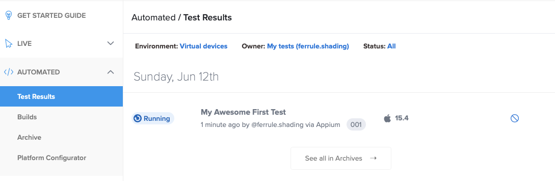 After the session starts, you can find your test on the "Test Result" page by name and build number, which was provided in capabilities.