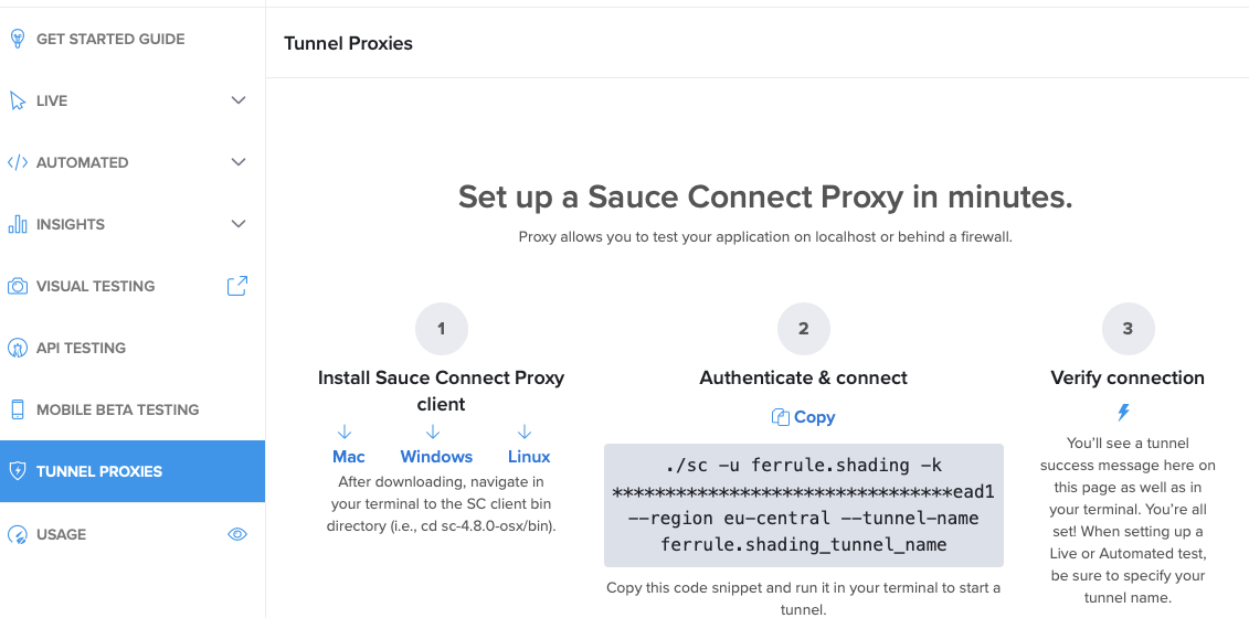 Sauce Connect Proxy Quickstart Guide provides detailed instructions about setup and use. On “TUNNEL PROXIES” page you can find links to binaries and quick start command.