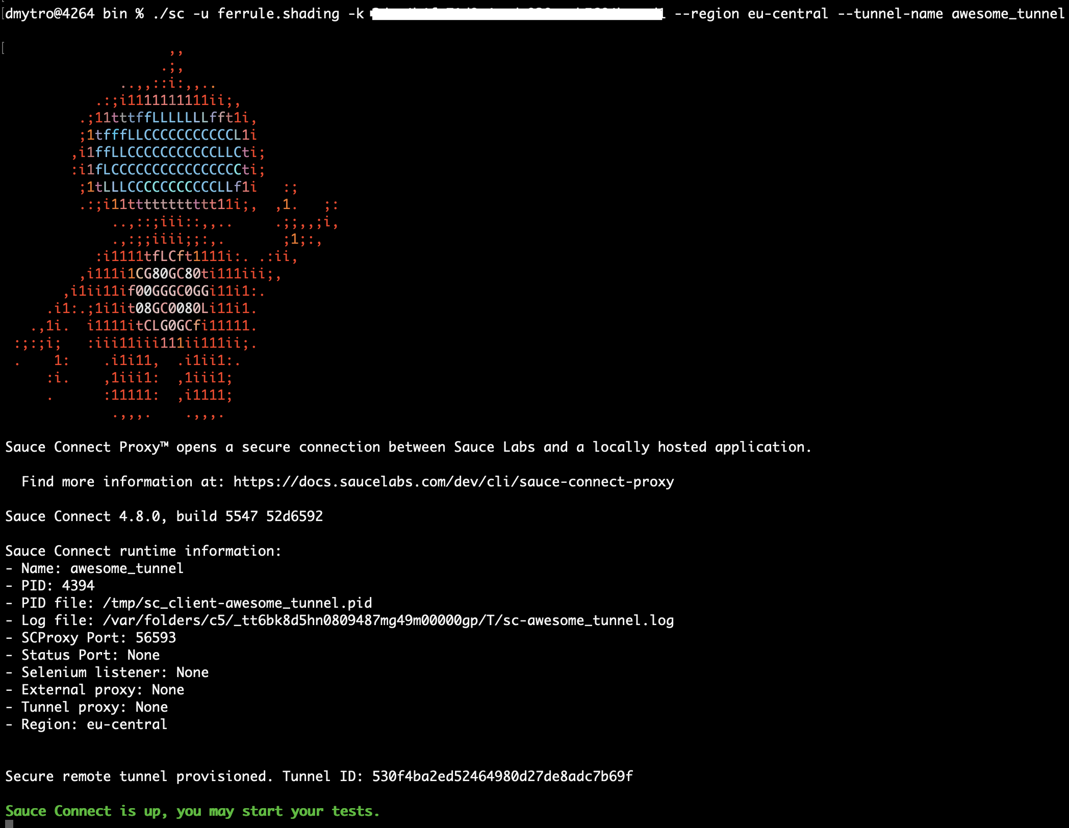 After a successful start, you receive a message in the console "Sauce connect is up.”