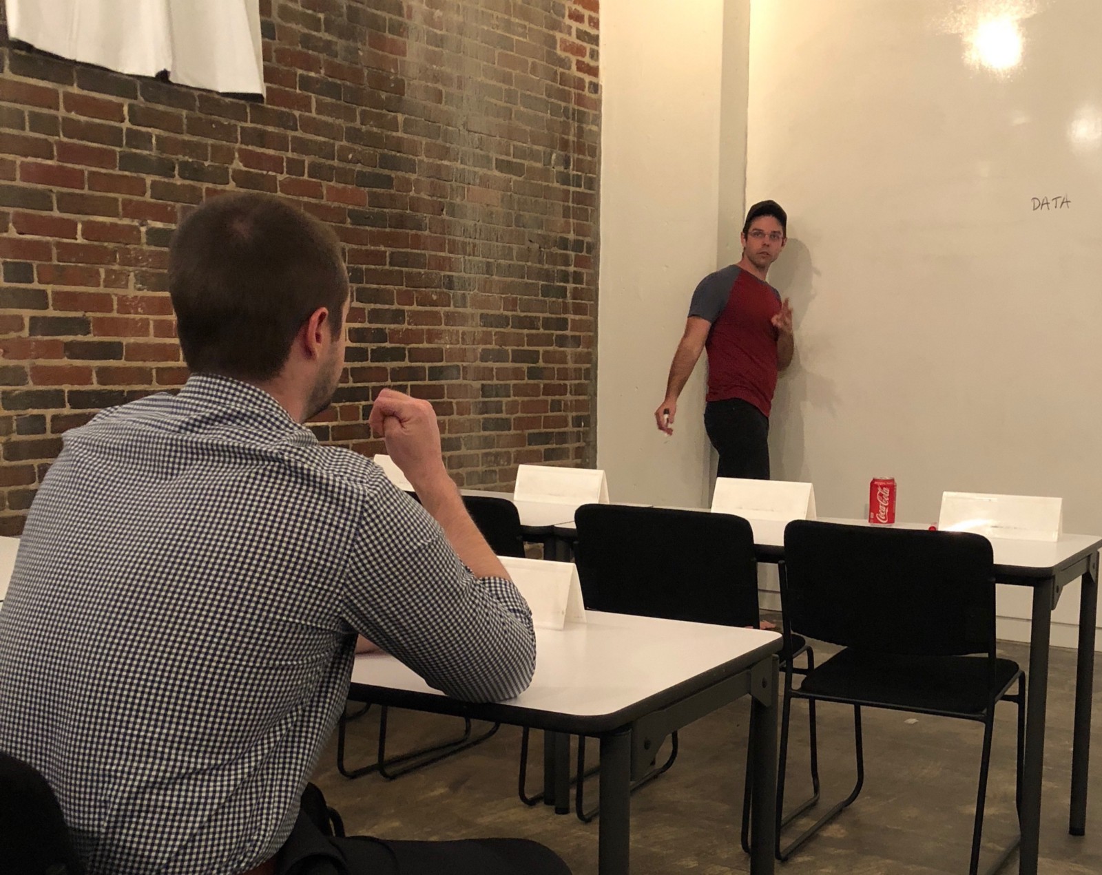 Hunter continuing with questions with a Solidity workshop attendant after class