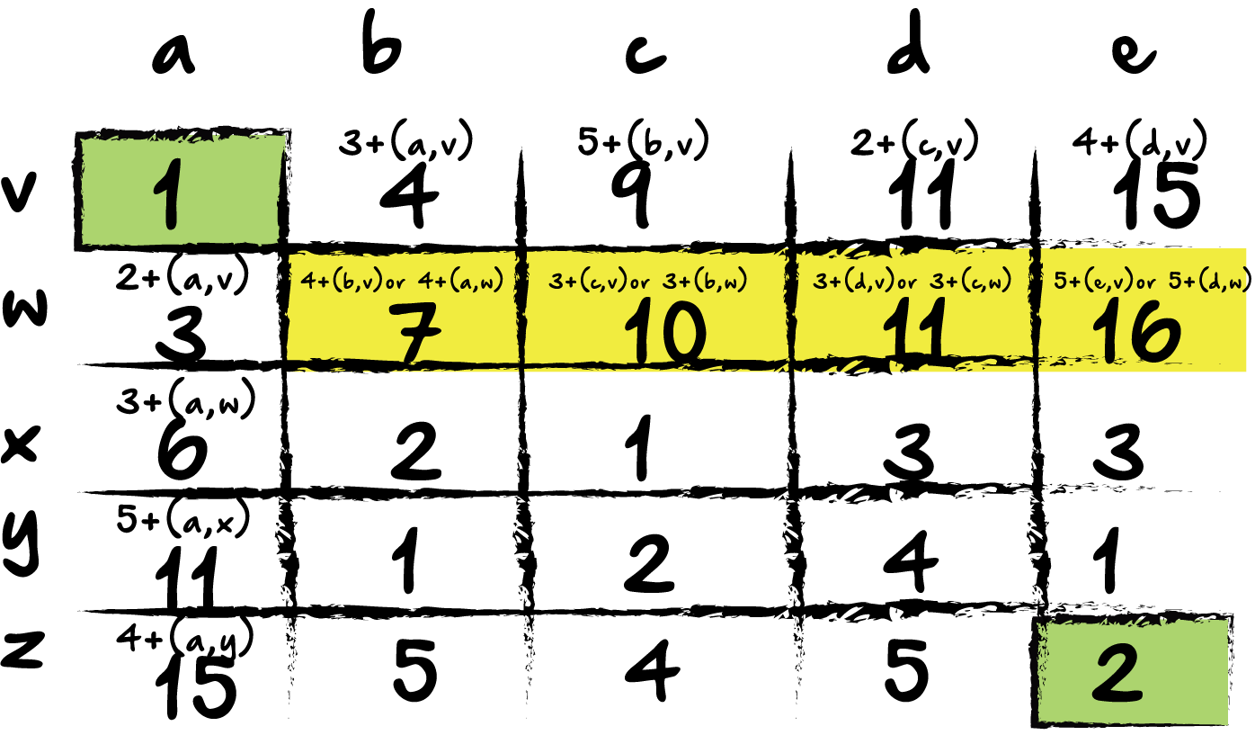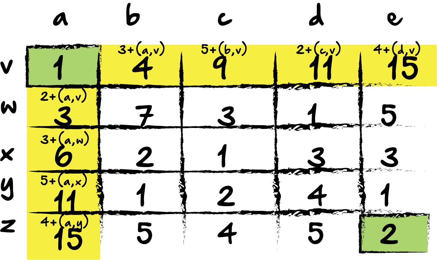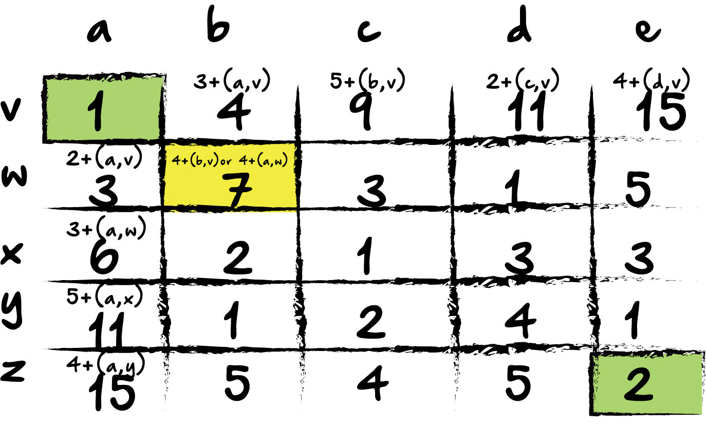 Now, we do something a little different for block (b,w). Because it has a block both above it and beside it to the left, we could add either block. Since we want the eventual minimum cost path, it makes sense that we will choose the block of the lesser value. In this case, it is block (a,w) with a value of 3. The updated value is 7, (3+4). Now, let’s do the same thing across the current row: