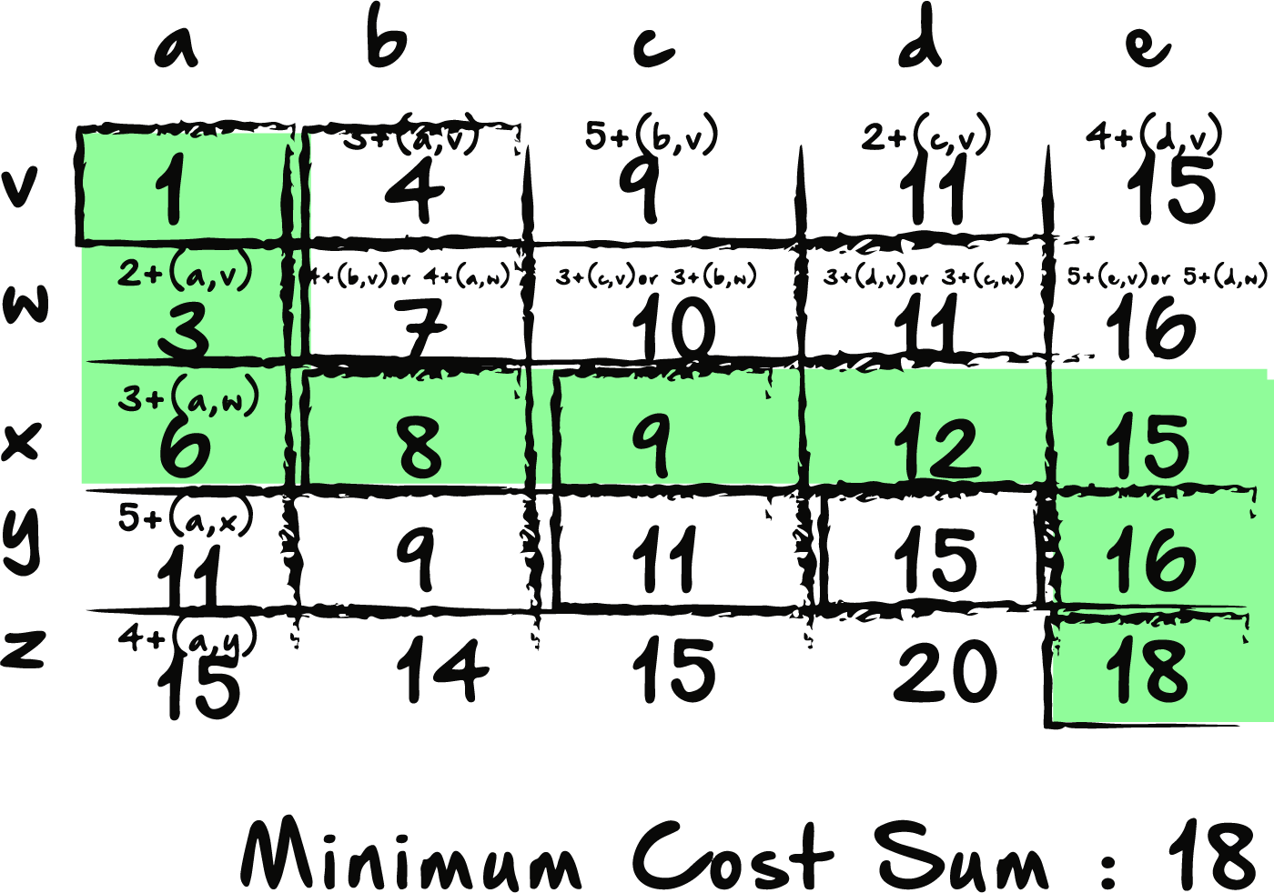 By adding all the minimum sums at each block, our ending block has a value of 18. If we trace our path backward, we can confirm that 18 is indeed our minimum cost sum. Now, this may seem somewhat trivial on this small example, but imagine again how much easier this method is, especially if our numbers were larger, or our grid had more values. Not to mention, this method is far more efficient than calculating and comparing each possible path.